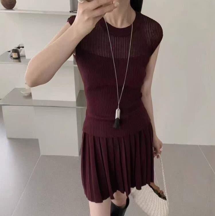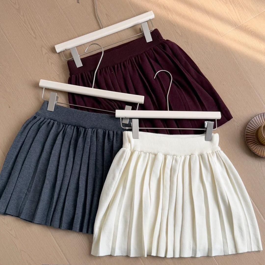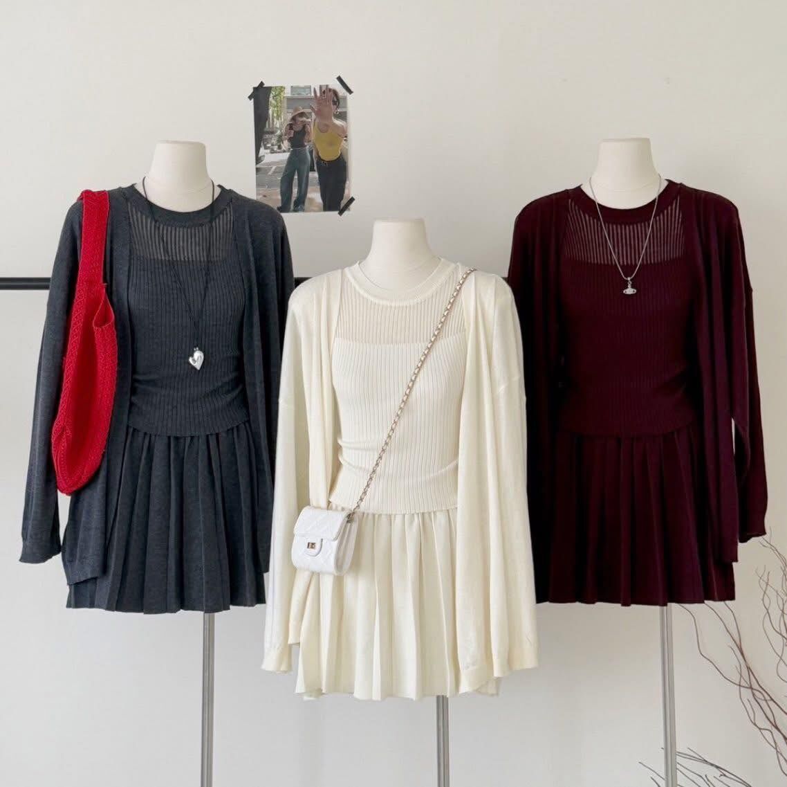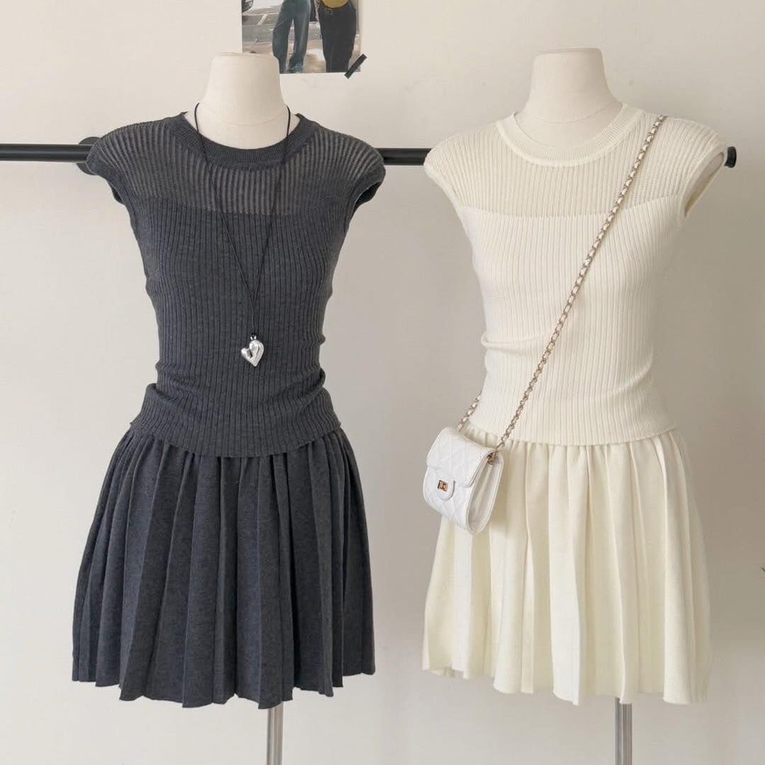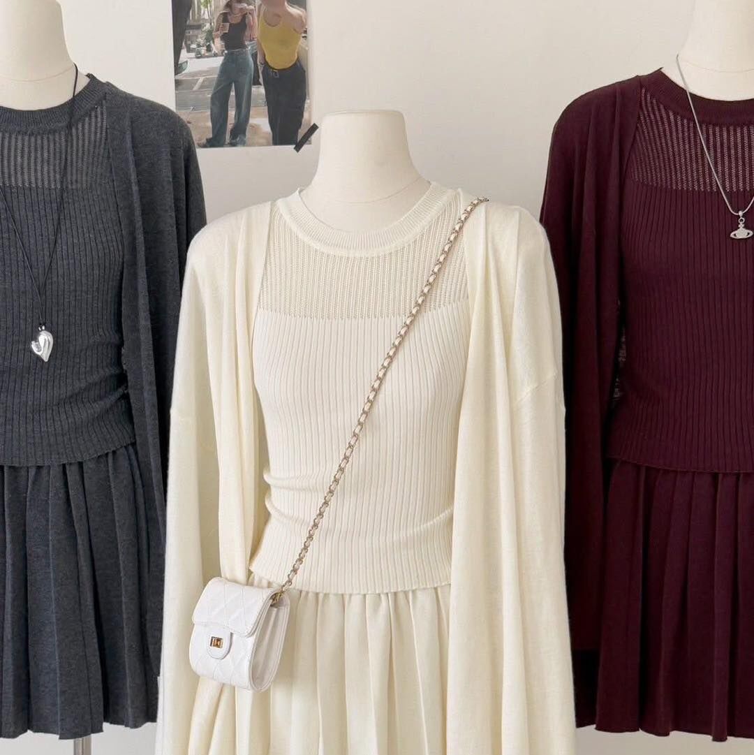 針織上衣+外套+合身百褶剪裁短裙
